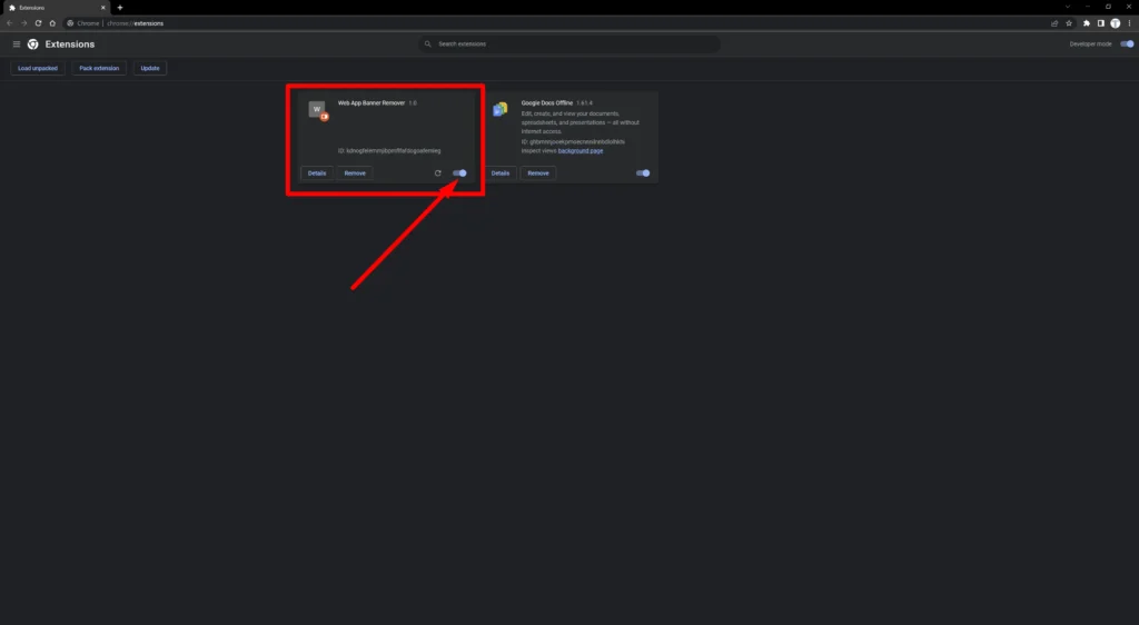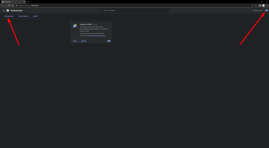 From the above screen, ensure you enable “Developer mode” from the top right.
