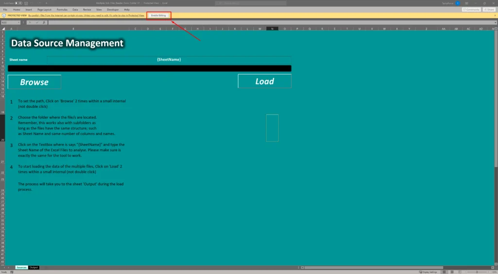 To be able to interact with the tool you should allow editing on the file by clicking the “Enable Editing” button present on the yellow bar at the top of the page.